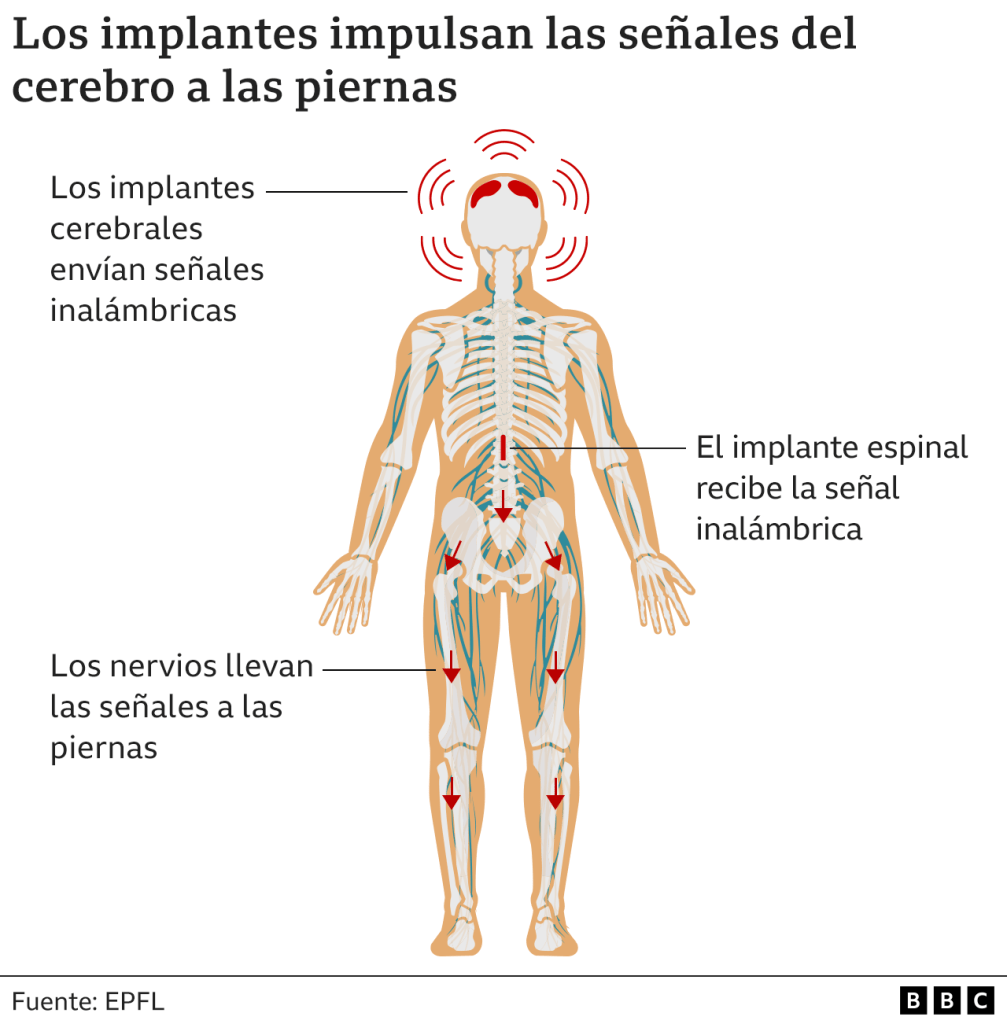 En Reino Unido una institución benéfica le ayudo para que el volviera a caminar. Se trata de un implante electrónico, está transmite los pensamientos inalámbricamente a las piernas y pies con otro segundo implante en la médula espinal. La profesora Jocelyne Bloch fue la neocirujana que hizo la operacion de insertar los implantes, muy delicada a mi parecer. La profesora recalcó que éste sistema de los implantes todavía está bajo investigación; sin embargo también dijo algo a considerar:
