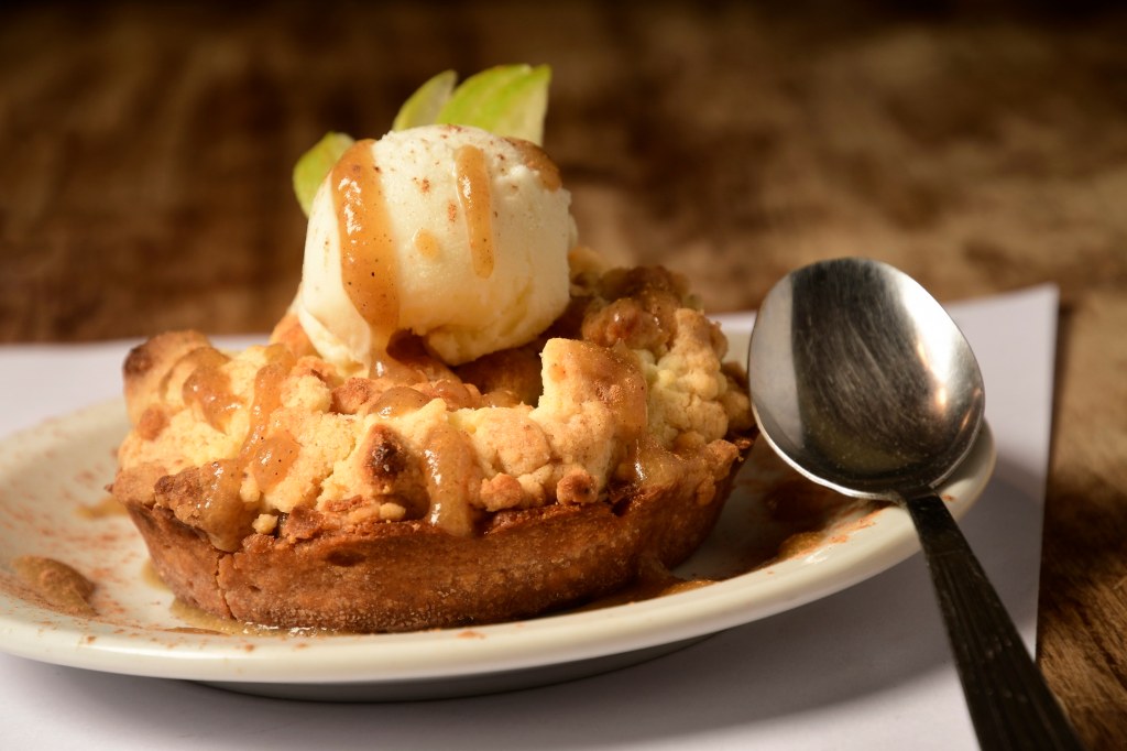 Este es un «pastel» formado con un poco de harina, mantequilla o manteca y azúcar con frutas o, como en la receta original, manzanas. Tiene una textura arenosa con toques dulces y salados debido a la mantequilla, pero como toda receta se ha ido modificando con el tiempo dependiendo de la región, agregando: helado, natilla, nuez y otras frutas o cambiando la harina por avena triturada u otras alternativas.