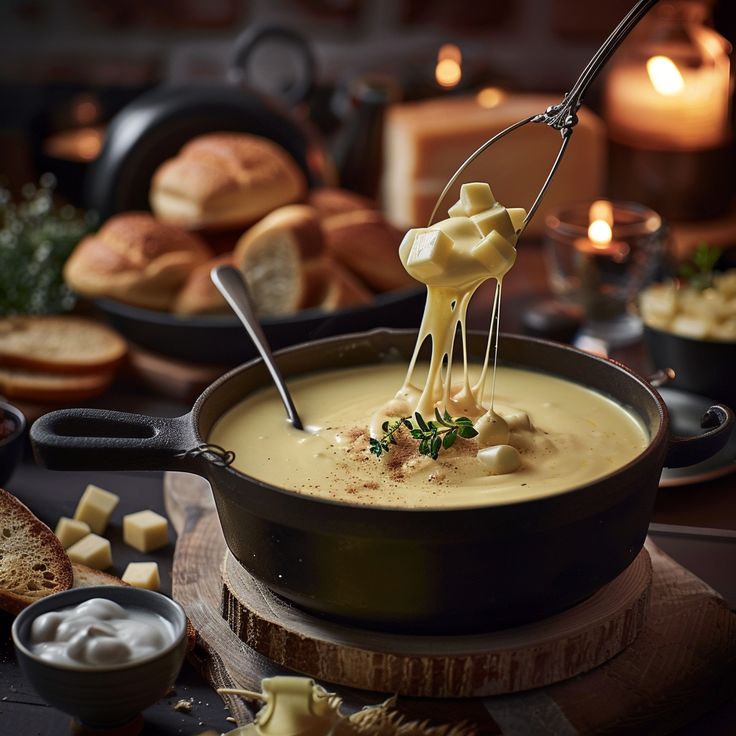 El suculento Fondue es una técnica de cocción que consiste en sumergir distintos ingredientes en un líquido caliente la mayoría de las veces queso, aunque también puede ser caldo o chocolate. La fondue es acompañada con el pan, que es lo común, aunque puedes sumergir salchichas, trozos de pollo, algunas verduras, más que nada para acompañar la salsa de quesos mezclados ya que esta salsa está hecha a base de muchos tipos de quesos.