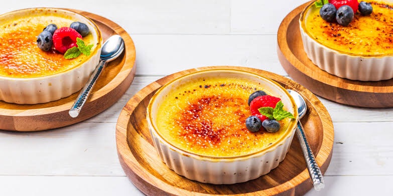 Mientras que la crème brûlée es una crema pastelera rica y cremosa, cubierta con una costra quebradiza de azúcar quemada.