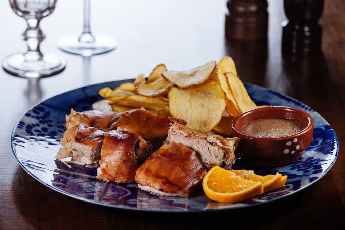 Comúnmente el Leitão es servido con unas muy buenas papas fritas en rodajas y una ensalada muy sencilla, pero muy buena y jugosa que te dará un buen sabor, equilibrando así las grasas de el platillo.
